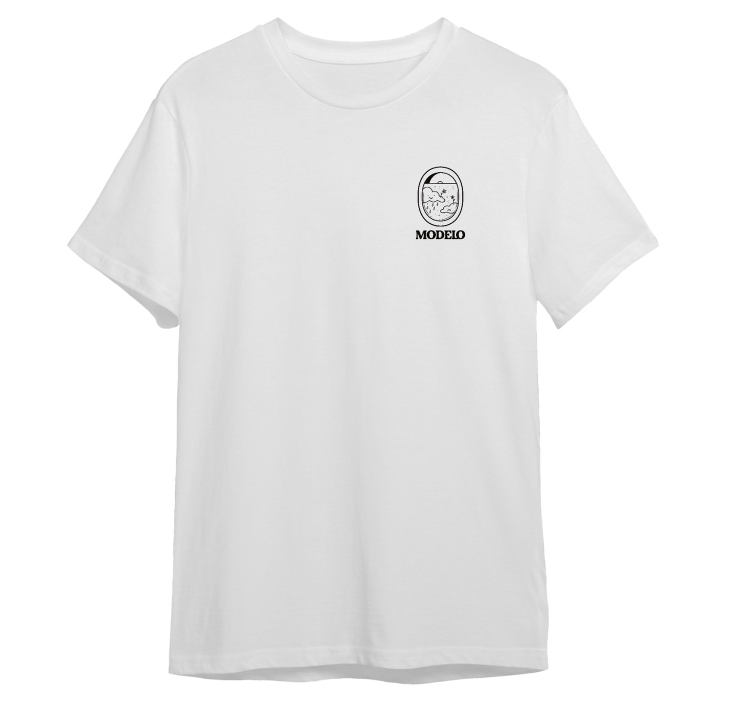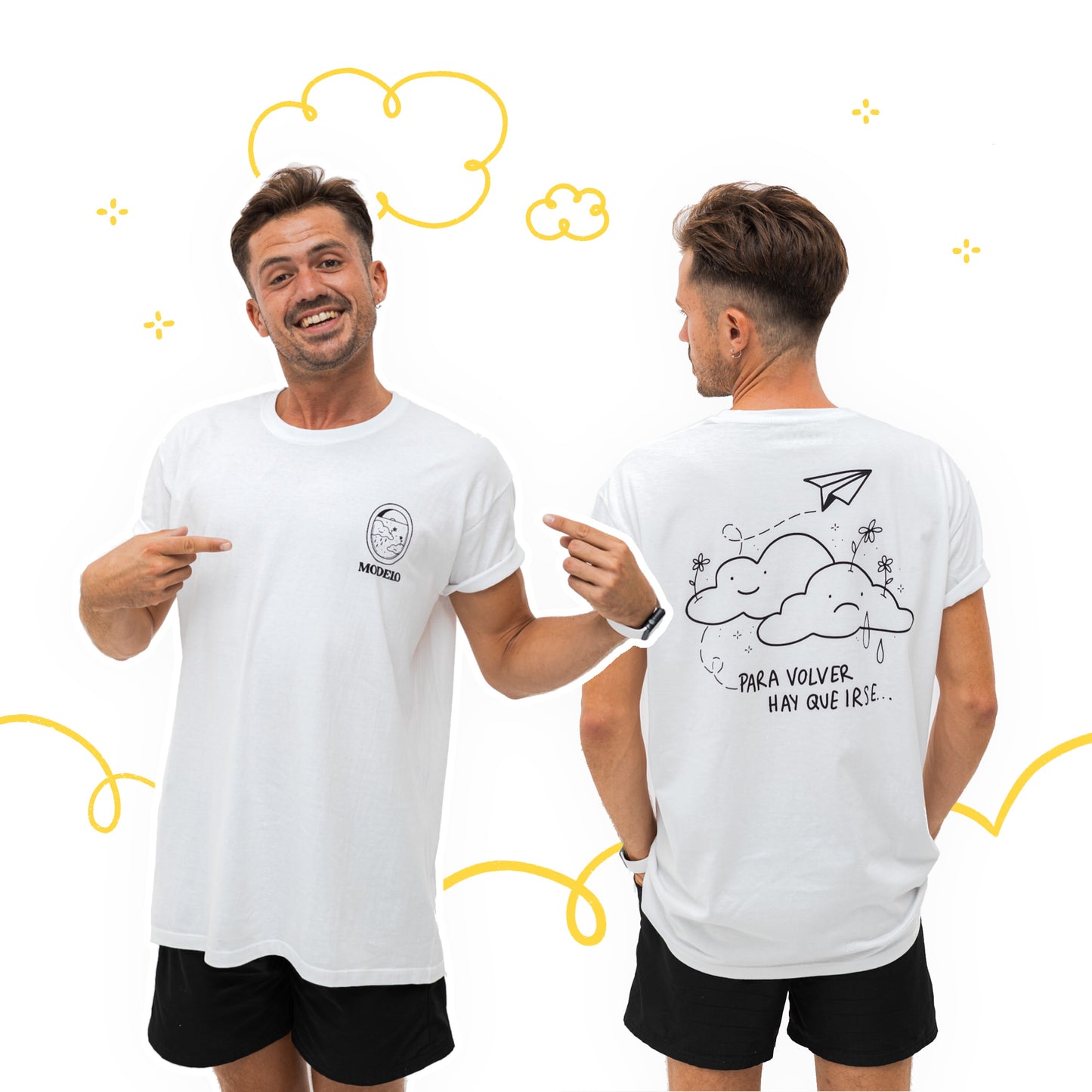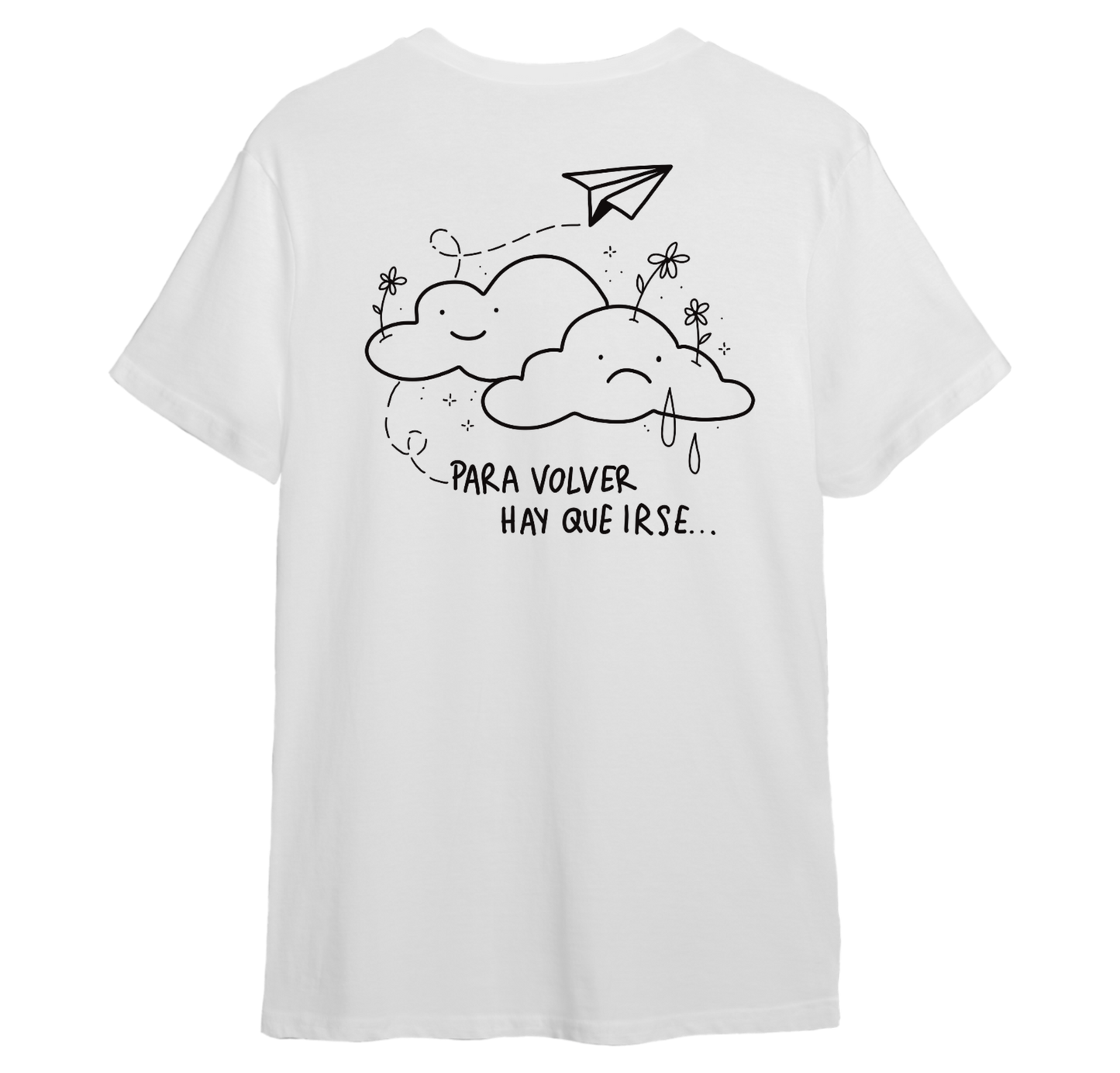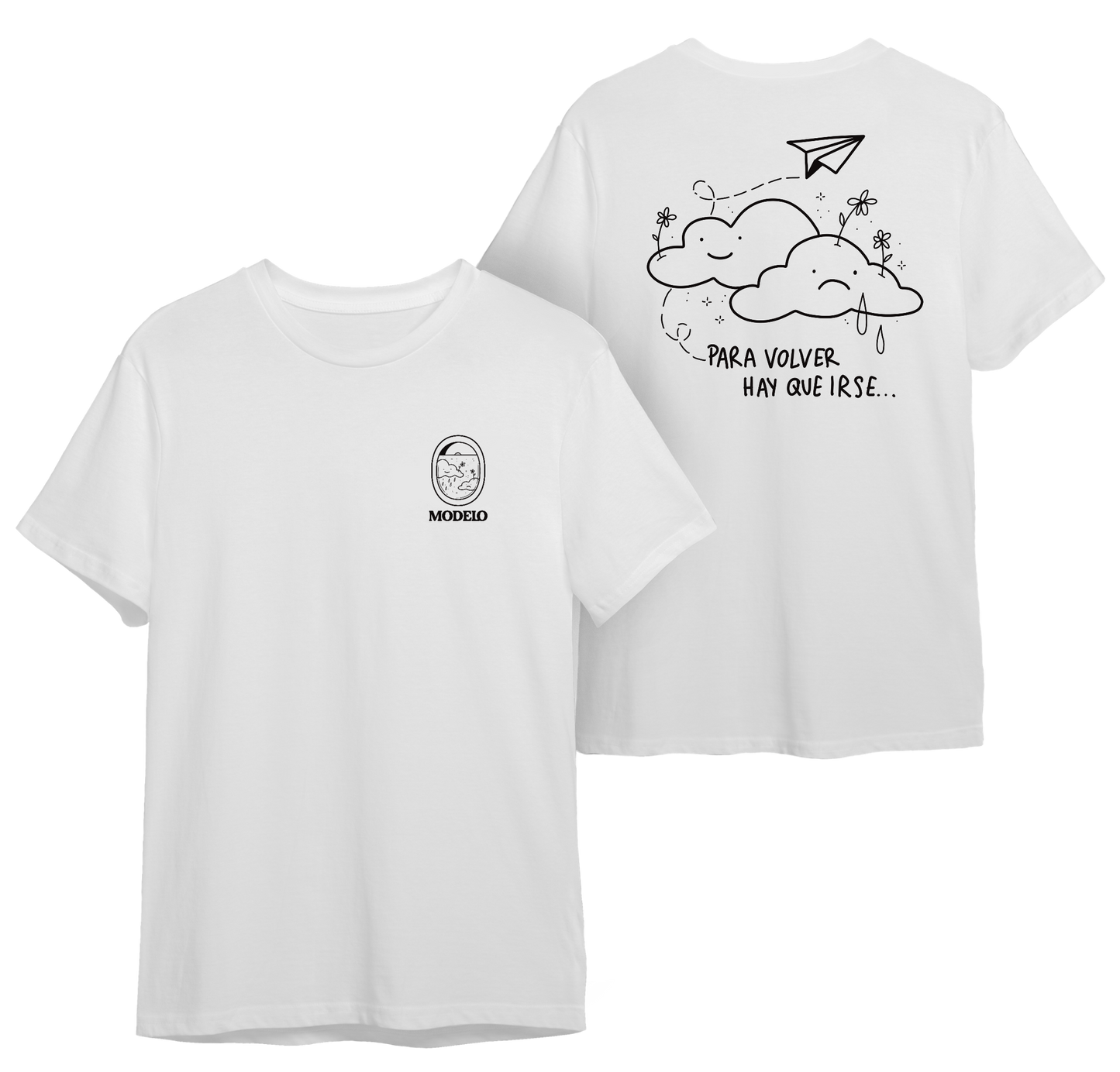 Camiseta blanca de manga corta, con LOGO MODELO "Ventanilla de avión" en el frente, y frase "Para volver hay que irse" por detrás